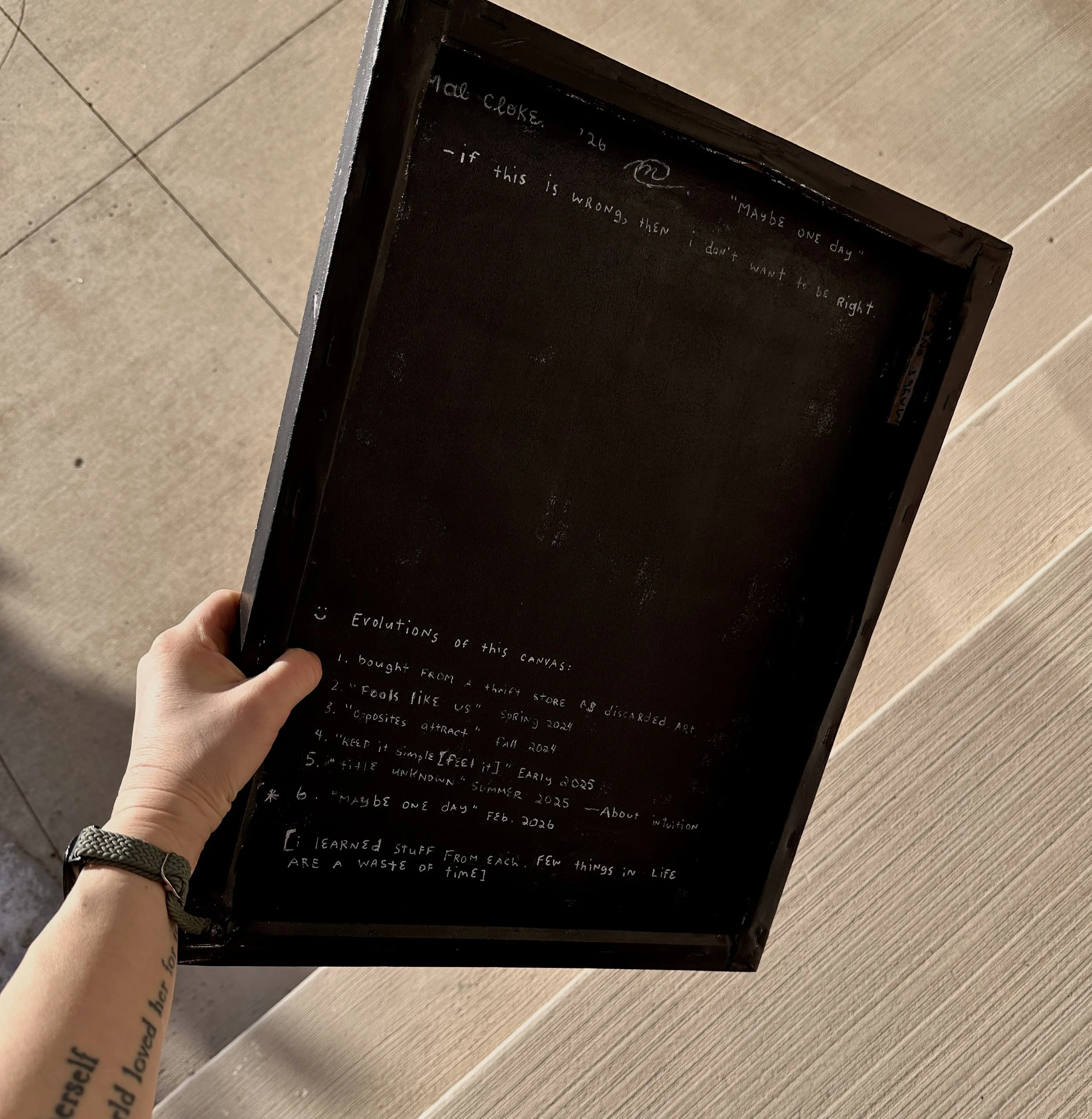 painting the back could be seen as a waste of time and uncommon by most. since i have painted on this canvas six different times after thrifting the canvas from a secondhand store with another painting on it, this canvas is like a black cat that’s on one of its last of nine lives and was starting to look like it.