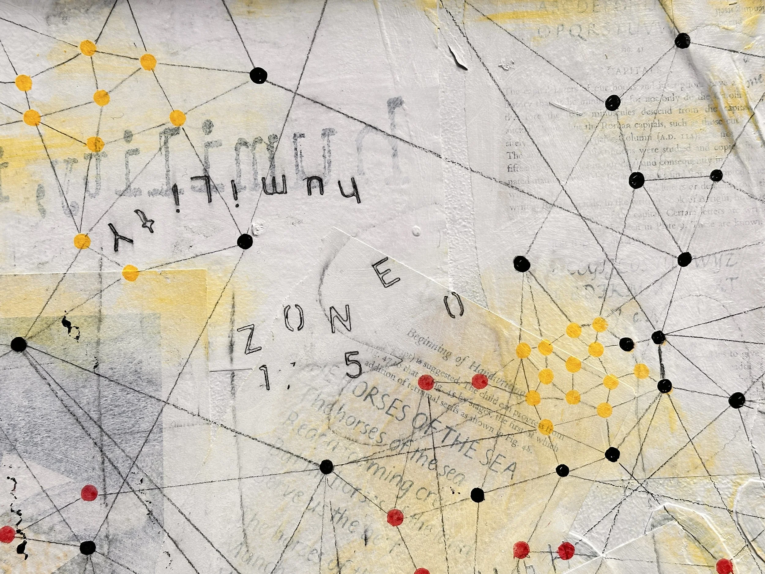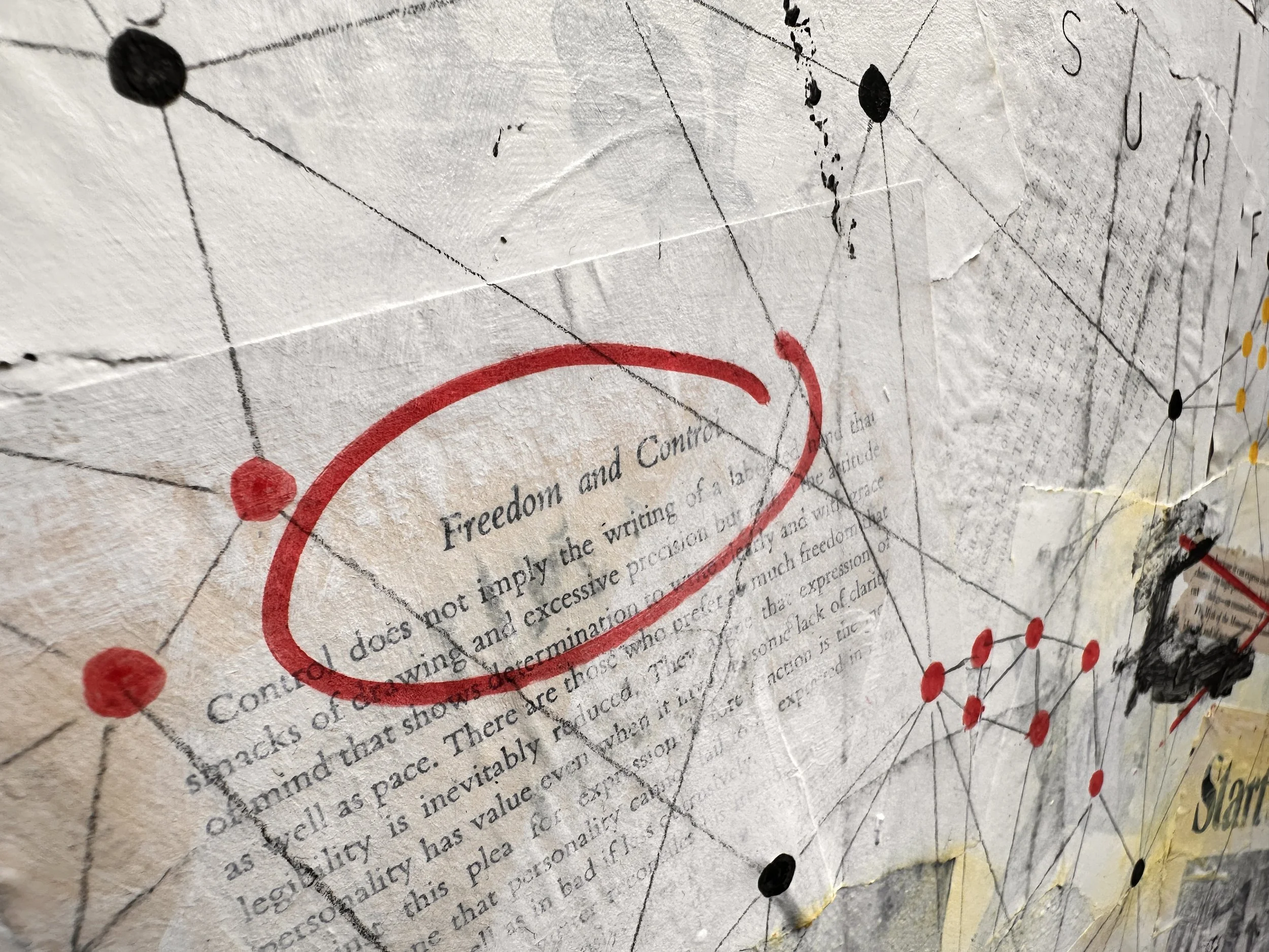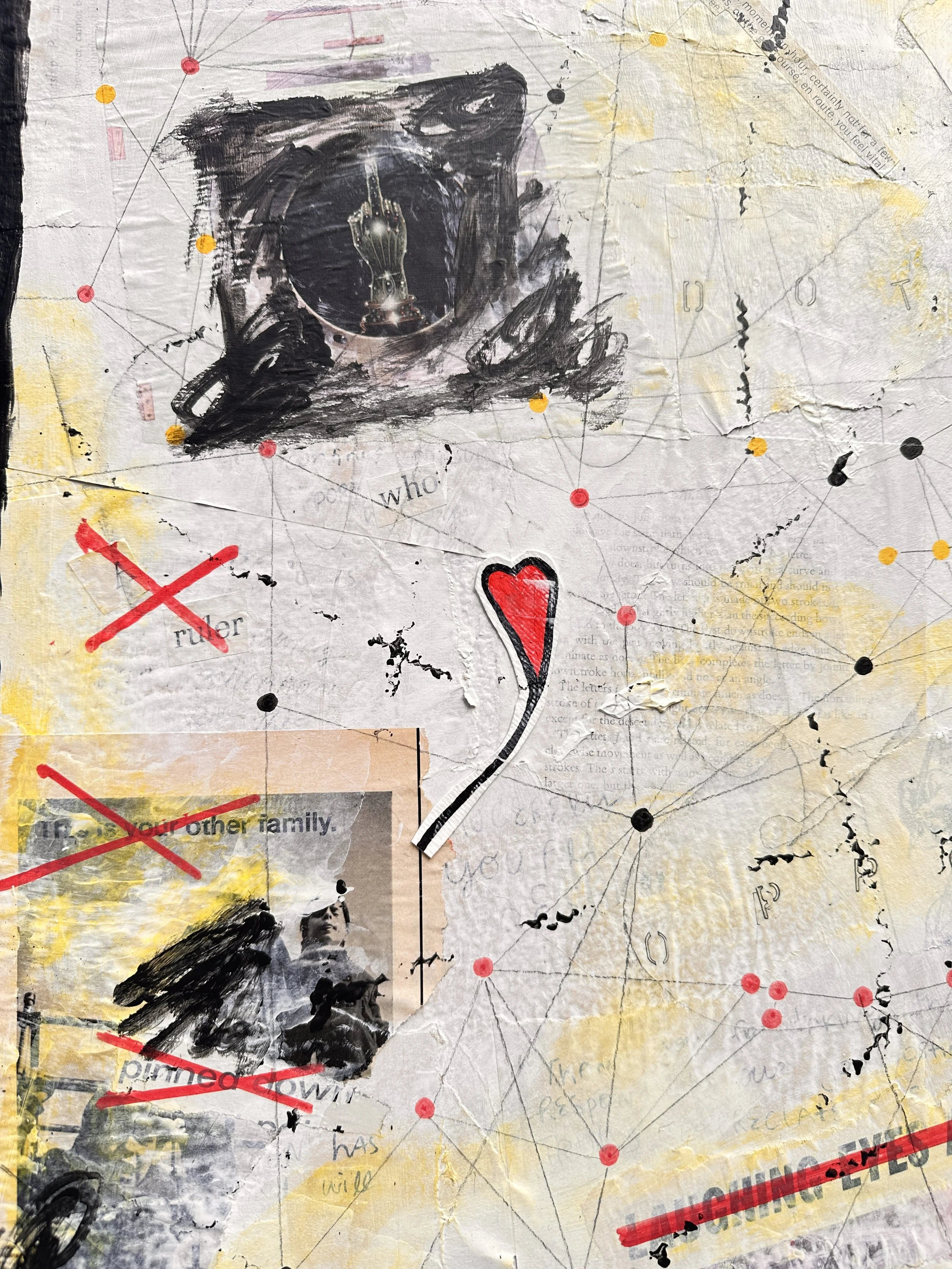the first layer had me writing out, by hand, most of the auto rejection emails I’ve received this year and then gluing them on quickly, messily, and with zero strategy. after you get so many rejection emails, they really all sound the same, even the ones where they seemed to try to sound original. if I don’t look at who sends these, I would have no idea. this is proof enough that the traditional way of working, hiring, and finding work is, to be frank, bullshit. this layer isn’t shown much in the final piece because i didn’t want it to be—the piece isn’t about this but this was just part of my process to getting here.