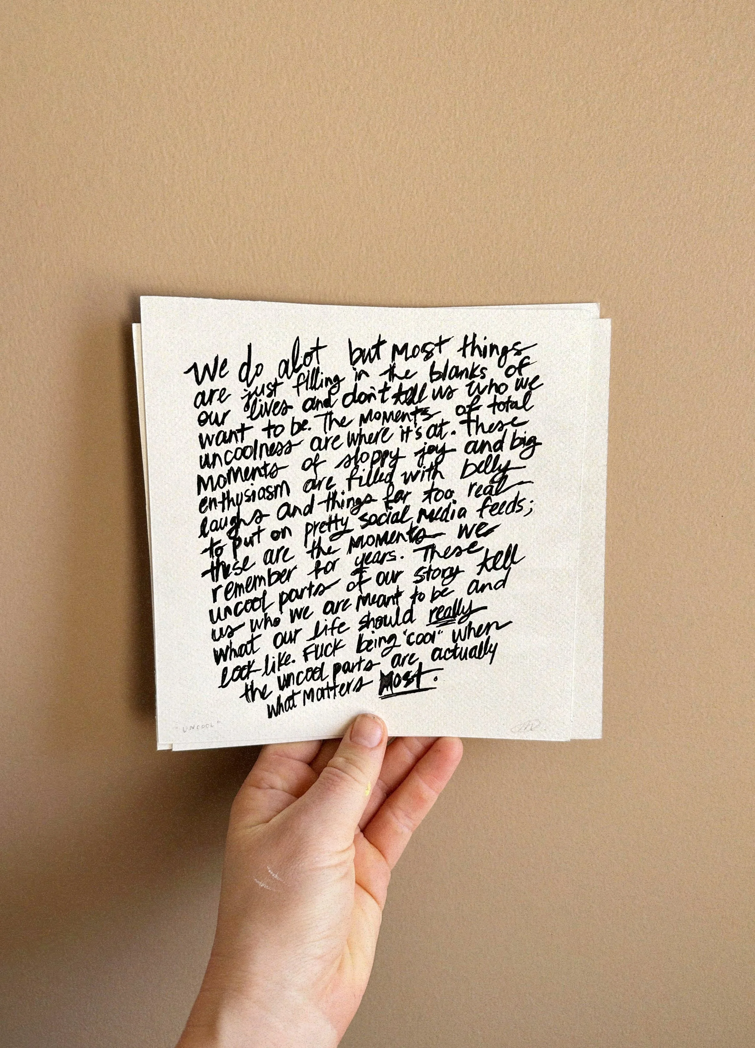 a collection of words i wrote and drew by hand based on the idea of being ‘uncool.’ uncool is about embracing your most authentic self——even if it seems uncool to someone else/society. the rambling run-on style words is to emphasize how we tend to talk when we actually love and care about something.