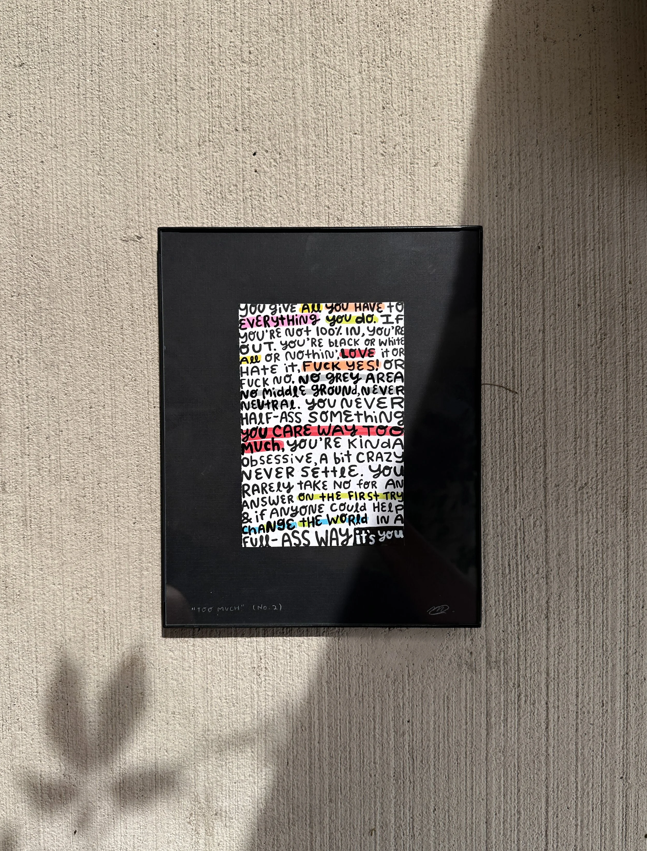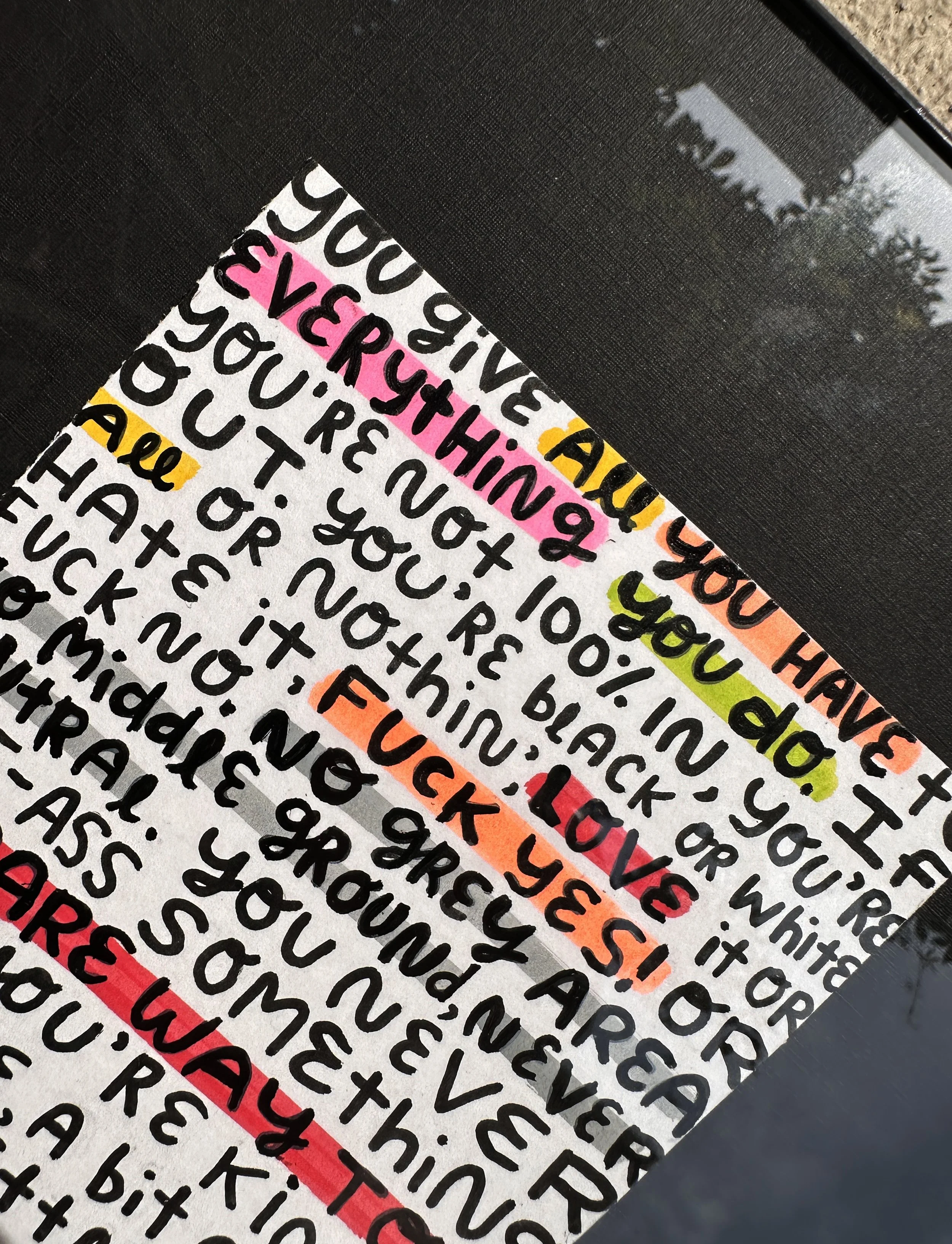 part of the uncool story; i did this pretty quickly, didn’t think about it or have a plan, and i quickly painted in random letters with whatever neon paint i chose next.