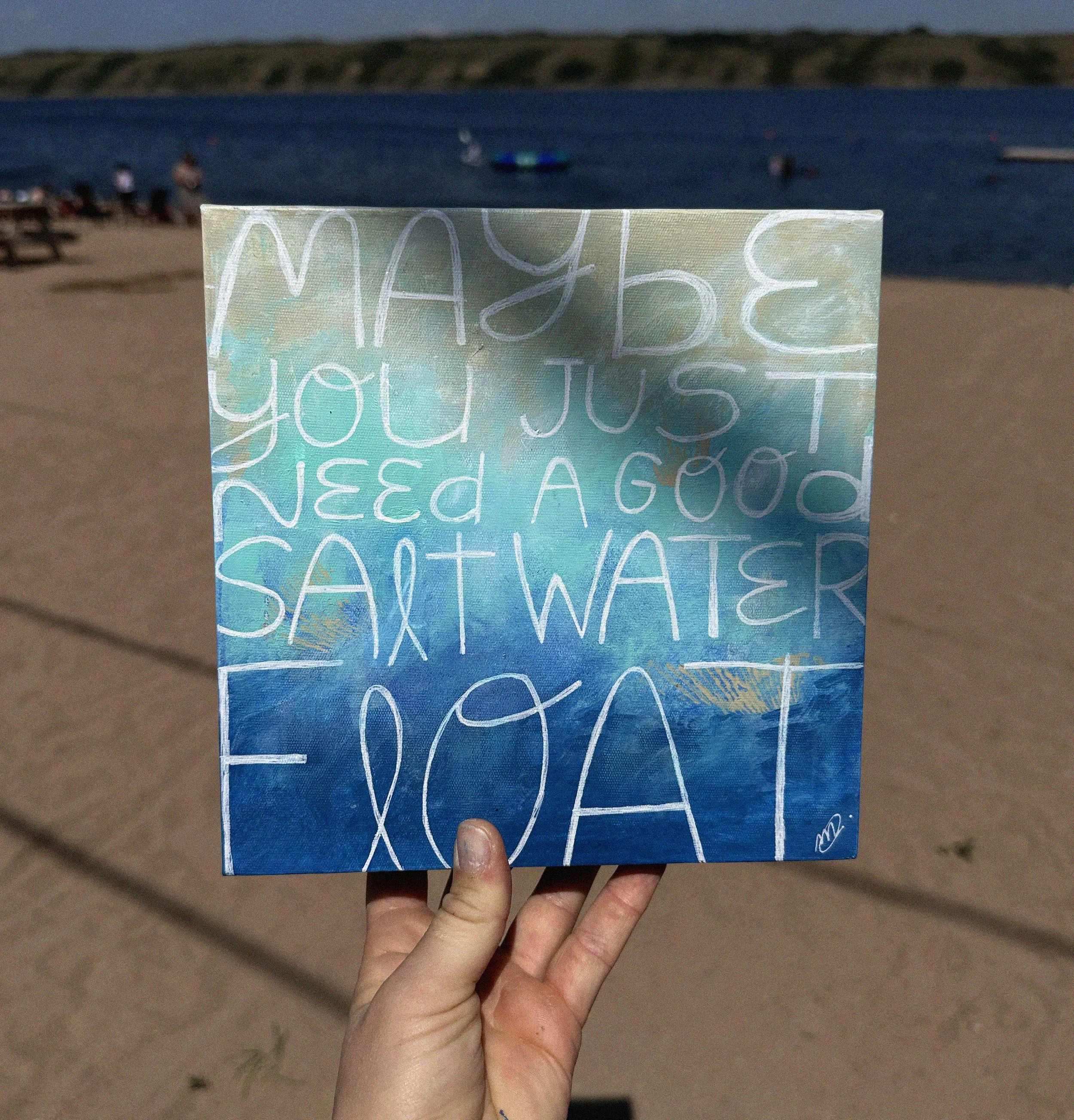and a little picture story about where the canvas came from. i had a less great week this summer so near the end of the week i went to manitou beach, sk for the day by myself. it wasn’t so much a fun beach day as much as it was a necessary day for my mental. right when i got there i took my paddleboard out into the middle of the lake, attached my ankle to the board, and then jumped off and sat in a water hammock in the middle of the lake for awhile