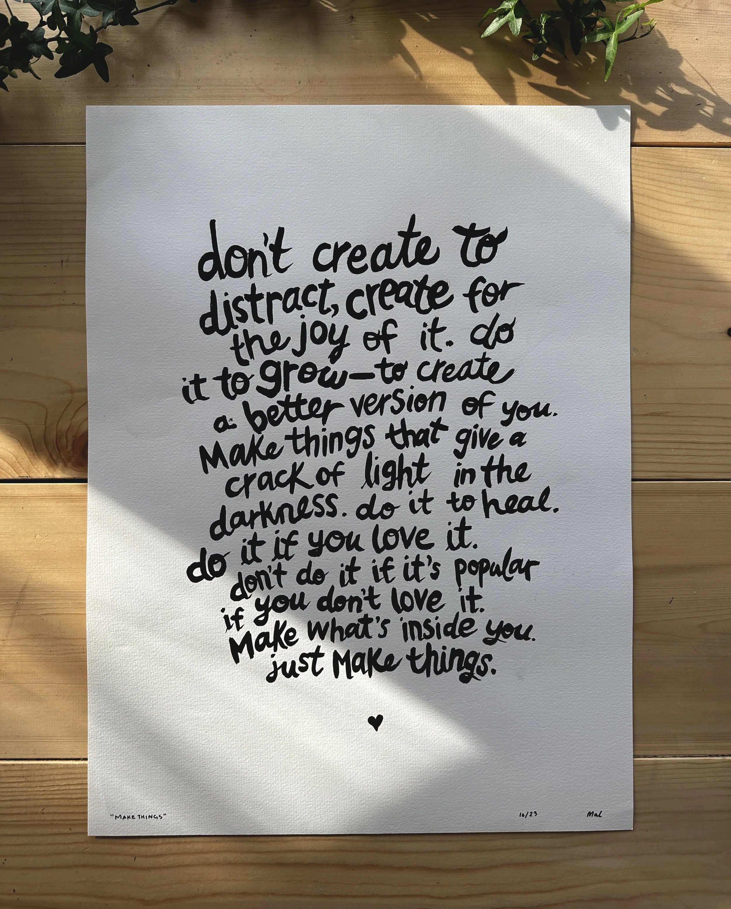 “don’t create to distract, create for the joy of it. do it grow——to create a better version of you. make things that give a crack of light in the darkness. do it to heal. do it if you love it. don’t do it if it’s popular if you don’t love it. make what’s inside you. just make things.”