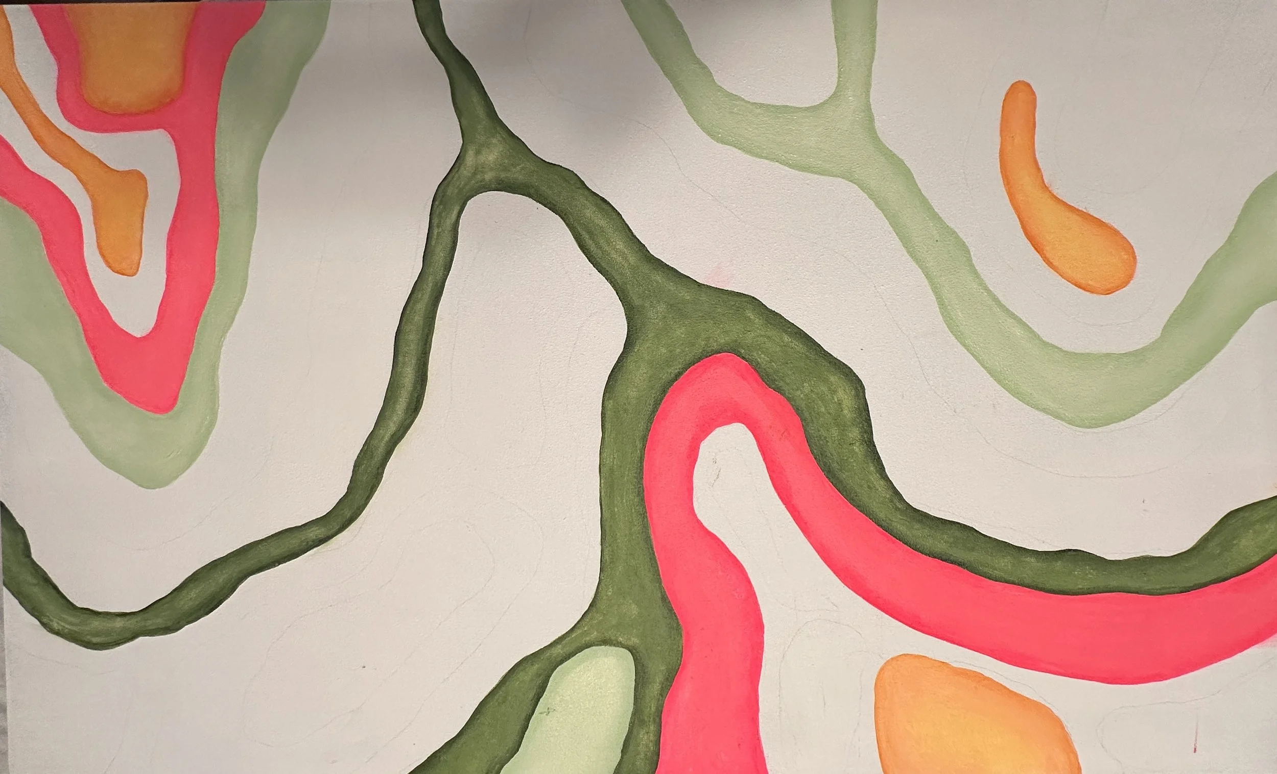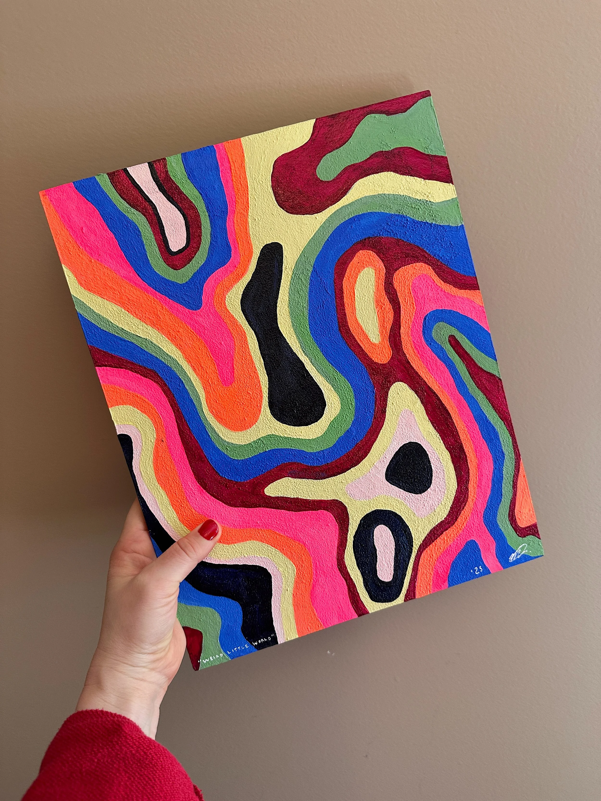 one reflects staying within our inner world and the other reflects exploring the world around us; both are important despite being opposing ideas. weird in both these paintings reflects diversity, differences, and authenticity. the works share a similar pattern that resembles an overview of earth and both share an intentionally odd selection of colours.