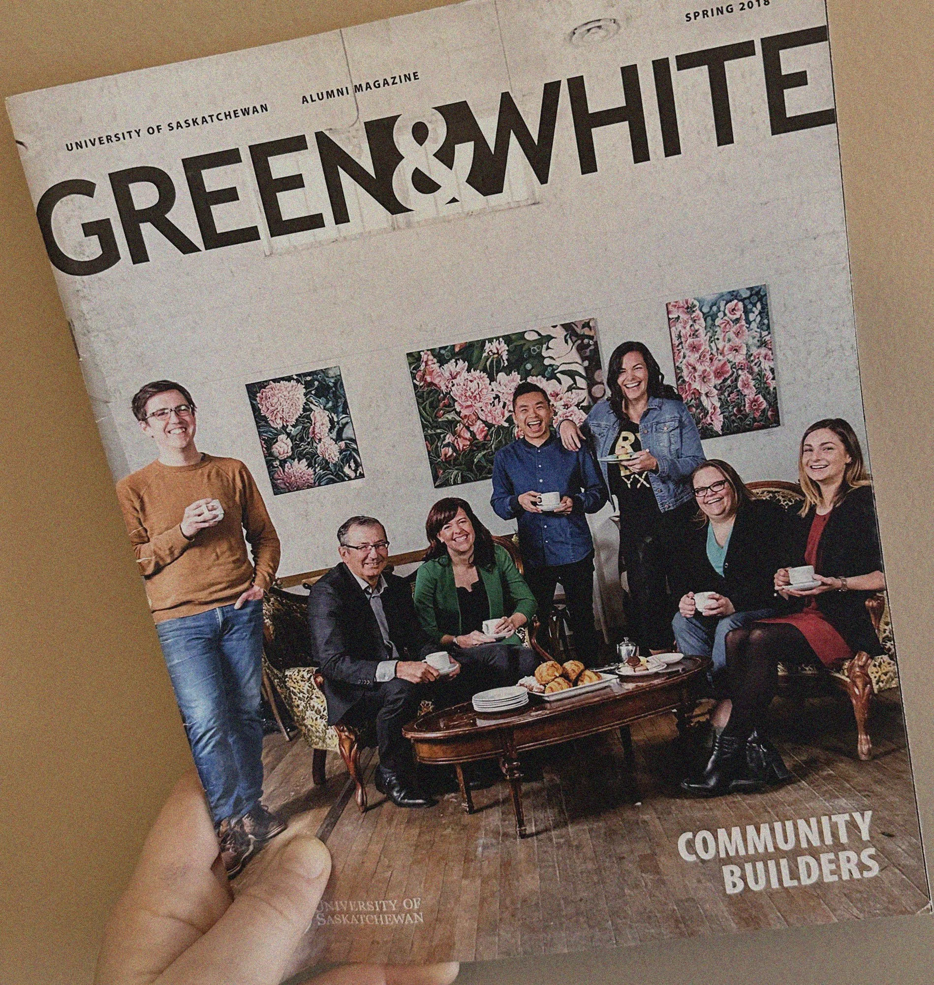 We knew the cover story was the one about a handful of local alumni turned entrepreneurs and we wanted to create a cover dynamic that would show everyone as if they were not just interacting as a group of alumni but more like old friends catching up. Saskatoon is a pretty small community and the alumni community in Saskatoon even smaller, so chances are they either were friends, or they had friends of friends.